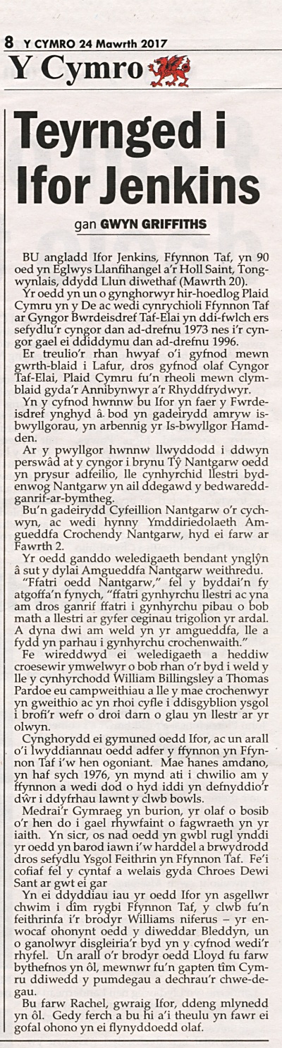 He was a member of Taff Ely council from 1973 to 1991, serving local people along with Gordon Bunn as Plaid Cymru councillors before being joined by Gerald Edwards. Ifor took pride in being Mayor of Taff Ely in 1991-2, the first Plaid member to hold the post.